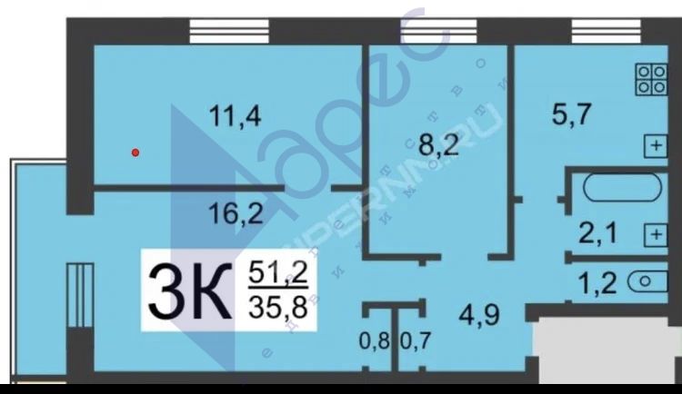 | Площадь (кв.м.) | Общая: 51 Жилая: 35 Кухня: 6 51 / 35 / 6 |